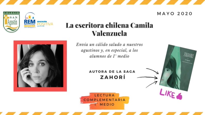Camila Valenzuela, joven escritora, editora y académica que ha publicado cuentos y novelas en distintas editoriales, y ha recibido importantes galardones por su trabajo, como el Premio Barco de Vapor 2014 por su novela “Nieve Negra”. También sus lectores han podido disfrutar las siguientes obras literarias; “Saga Zahorí”, “El legado”, historia de corte fantástico inspirada en el Sur de Chile. “ Antes de volver a caer “, “ Las durmientes “, “ La espera “, entre otras. Ha enviado un mensaje a toda la Comunidad Agustina. ¡¡¡¡ Agradecemos sus palabras !!!